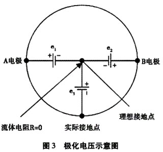在被測(cè)液體與電極和接液部件接觸過(guò)程中,電解質(zhì)中的正負(fù)離子會(huì)分別作定向運(yùn)動(dòng),這會(huì)使被測(cè)液體在電極和接液部件之間形成電位差,通常將這種現(xiàn)象稱為極化現(xiàn)象。如圖3所示,理論上來(lái)說(shuō),兩電極A和B對(duì)接液部件的電位e1、e2大小相等、方向相反,此時(shí)兩電極的電位差等于零。但是,若兩電極的材質(zhì)或表面狀態(tài)存在差異,此時(shí)A、B電極之間的電位差就不為零,這就形成了極化電壓,極化電壓與共模狀態(tài)的電壓e3一起疊加在流量信號(hào)中,被輸入轉(zhuǎn)換器的差動(dòng)放大器。當(dāng)極化電壓過(guò)大,則會(huì)對(duì)差動(dòng)放大器的輸入端造成較大影響,導(dǎo)致信號(hào)無(wú)法放大或流量信號(hào)的輸出波動(dòng)過(guò)大,從而降低了電磁流量計(jì)的測(cè)量精度。