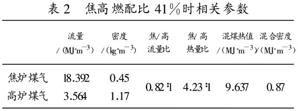 實(shí)際生產(chǎn)上采用的焦?fàn)t、高爐煤氣的配比為百分之四十一左右,有時甚至更低。現(xiàn)以配比為百分之四十一為例,相關(guān)參數(shù)如表2。