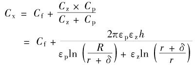 電容中心電極半徑為r,內(nèi)電極絕緣層厚度為 ∂,絕緣材料介電常數(shù)為 ep,傳感器外電極內(nèi)表面半徑為R,電極長(zhǎng)度為 六,se; 為注入水介電常數(shù),根據(jù)同軸柱狀電容器容量計(jì)算公式,可得絕緣層和被測(cè)介質(zhì)的電容 Cp、Cz, 為: