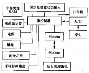 微控制器采用89C52:探頭選用壓力式探頭,可克服超聲波式探頭易受污水中泡沫十?dāng)_的弊病;A/D轉(zhuǎn)換器選用AD1674;時鐘芯片選用DS1302;液晶顯示器為點陣式的MGLS19264,可顯示四行漢字;非易失性RAM選用DS1230;打印機為普通微型打印機;采樣脈沖輸出端口用來輸出采樣脈沖,控制采樣器采樣污水;污水處理器狀態(tài)輸入端口可輸入污水處理器的通斷時間,供遠程監(jiān)控作用。